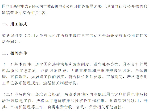 ->查看國(guó)網(wǎng)江西省電力有限公司豐城市供電分公司因業(yè)務(wù)拓展需要,現(xiàn)面向社會(huì)公開(kāi)招聘段潭鎮(zhèn)營(yíng)業(yè)廳綜合柜員1名:一、用工形式勞務(wù)派遣制(錄用人員與我司江西省豐城市惠豐勞動(dòng)力資源開(kāi)發(fā)有限公司簽訂勞動(dòng)合同)。二、招聘條件(一)基本條件:遵守國(guó)家法律法規(guī)和規(guī)章制度,遵守社會(huì)公德,...